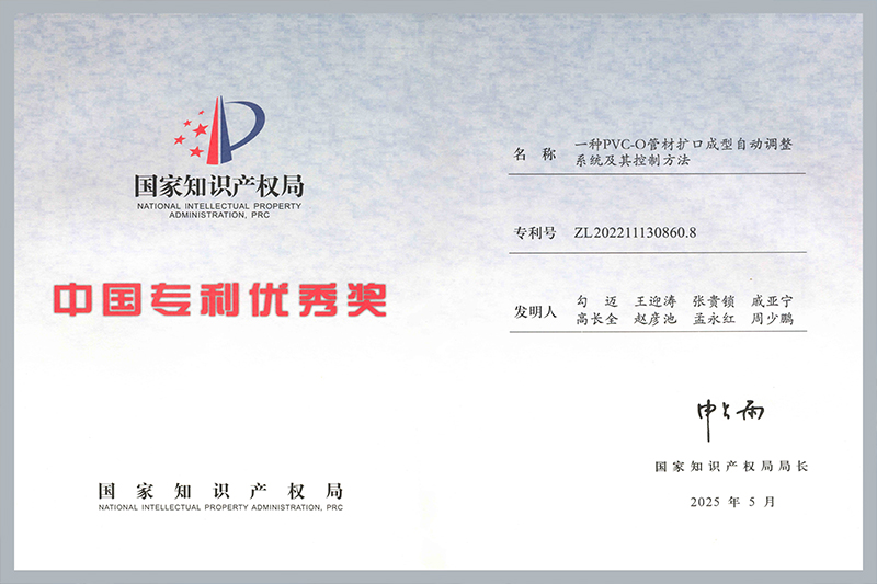 获奖专利聚焦PVC-O(双轴取向聚氯乙烯)管材生产中的关键环节——扩口成型工艺。该系统通过智能化控制方法,实现管材承口部位成型精度与一致性的突破性提升,从根本上解决了传统工艺中“胶圈易顶翻、接口易泄漏”的行业难题。依托该技术生产的PVC-O管材,不仅在抗冲击、耐外压、抗疲劳及耐低温等方面表现优异,更在管道系统长期使用的安全性与密封性上实现了质的飞跃。