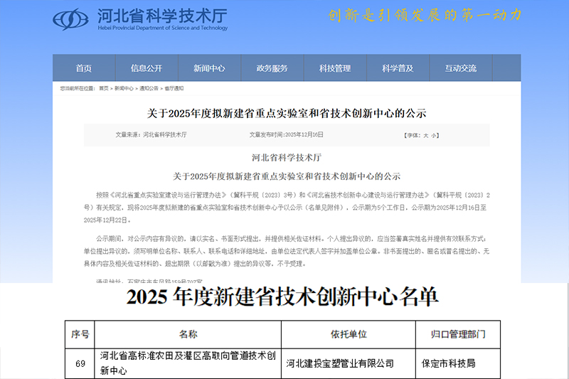 近日,河北建投宝塑管业有限公司顺利通过河北省科技厅等部门联合评审,成功认定为“河北省高标准农田及灌区高取向管道技术创新中心”!